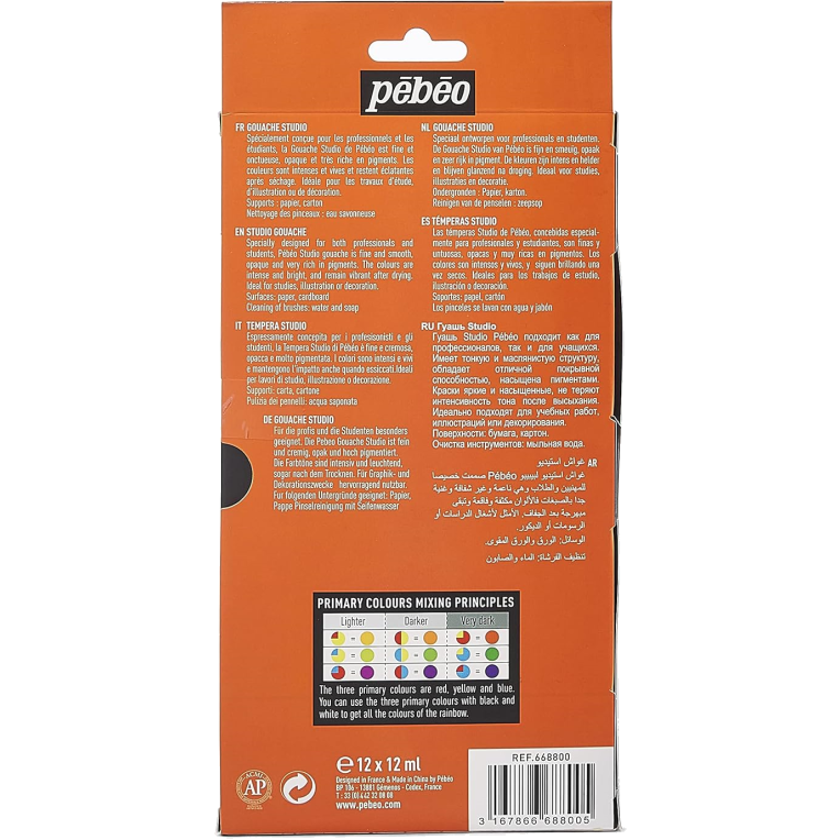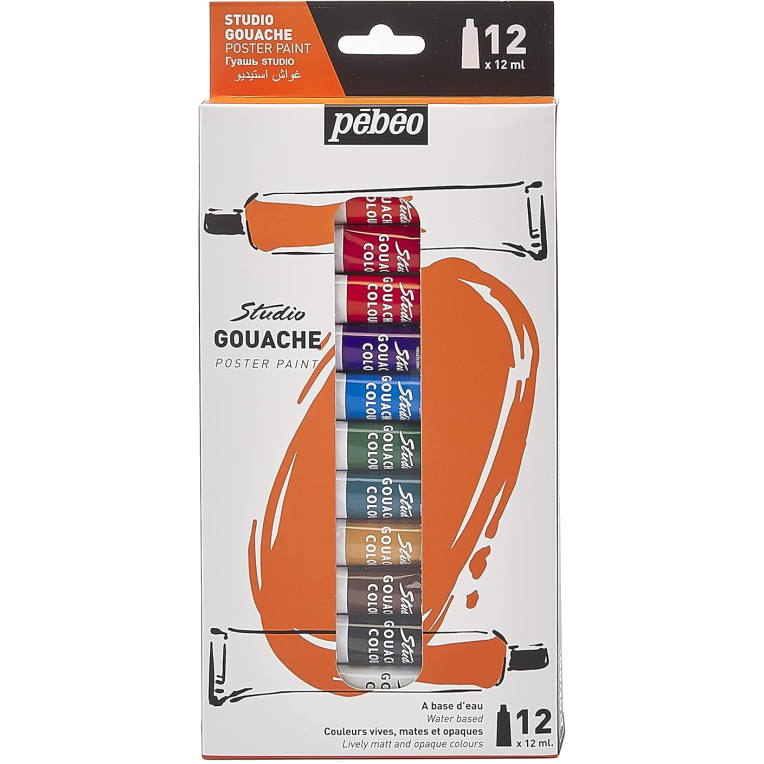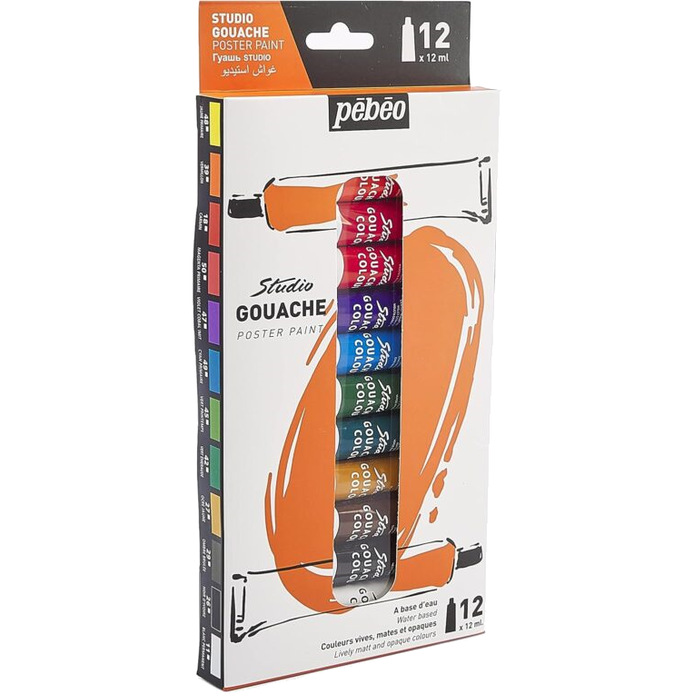 Pébéo est un fabricant français reconnu, créé en 1919 à côté de Marseille. Il offre une large gamme de produits, adaptés aussi bien aux amateurs qu’aux professionnels. Leur Gouache Studio est une gouache fine, spécialement conçue pour les professionnels et les étudiants. Les couleurs sont concentrées en pigments, vivaces, opaques, mates, avec une bonne résistance à la lumière et miscibles entre elles.